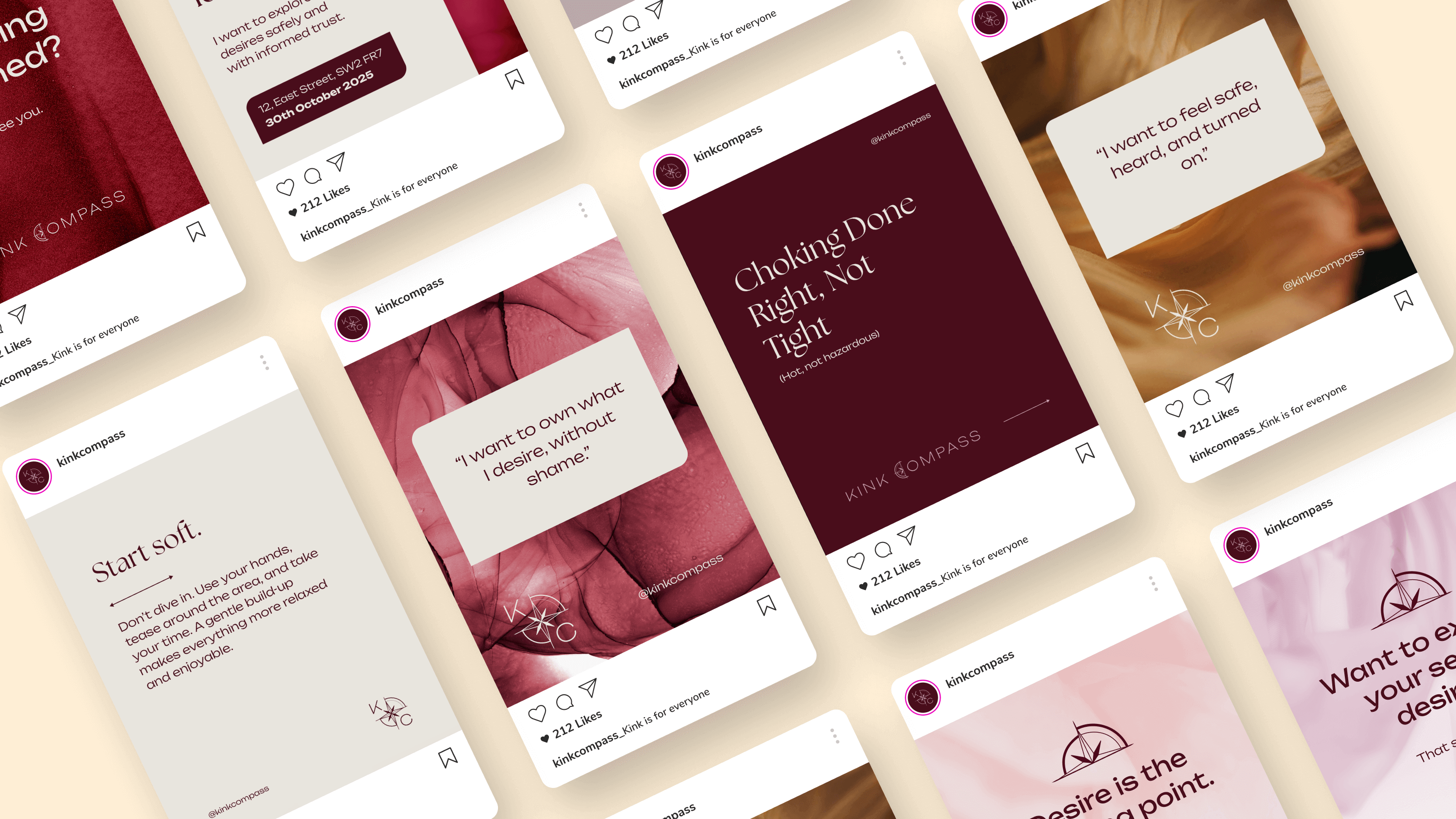 To create something that would truly engage people, we needed insights. So we started with data and behaviour science to discover exactly who we were targeting. The results outlined a clear gap in the market for a specific customer segmentation - the curious seekers, people who want to explore their sexual desires but don’t know where to start. We then ran brand workshops connecting the founder’s vision and values to these audience insights to help shape a visual and verbal identity that felt fresh, resonant and movement worthy. From there, we built a comms strategy rooted in this insight to not only help the community grow, but to ensure they stayed engaged. Since launch, they have had a fast organic influx into their community and a dramatically positive brand sentiment. The process directly influenced business strategy, too and set them up to gain more audience insight with every new community member. This has allowed Kink Compass to turn sexual curiosity into a movement, and they’re only just getting started. We also built a custom Kink Exploration Style Quiz, which encouraged community engagement from the get-go, and this is where the majority of their subscribers have come in from.
